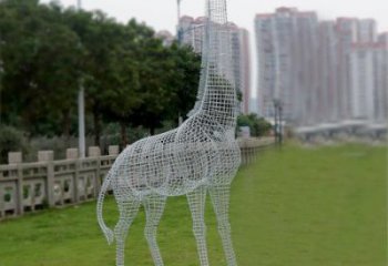 街邊擺放創(chuàng)意大型不銹鋼網(wǎng)格長頸鹿動物雕塑